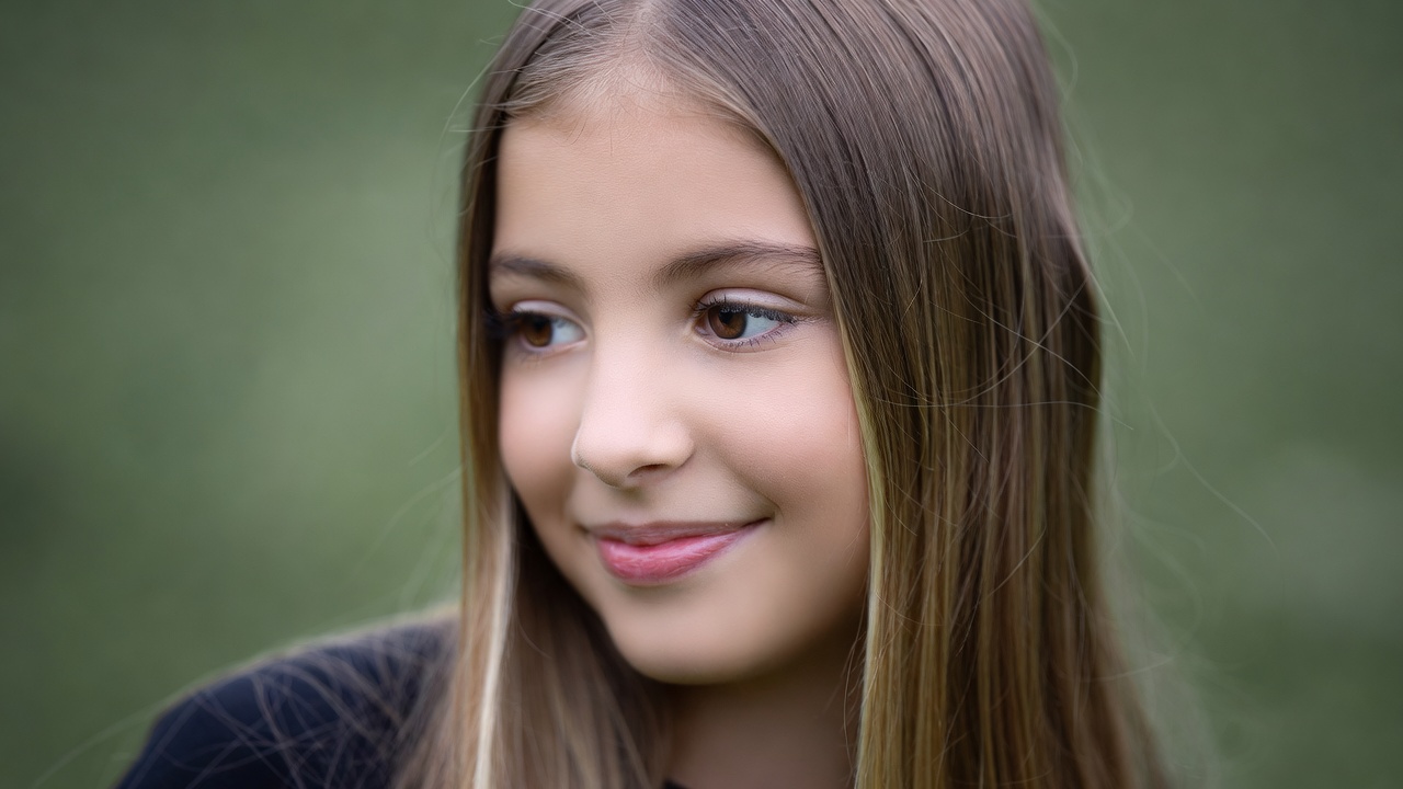 A young girl with long straight brown hair smiles gently while looking to the side. She has fair skin, brown eyes, and wears a dark top. The background is a soft green outdoor setting.