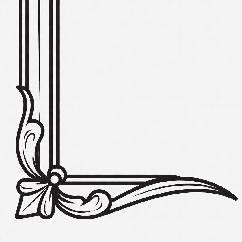 A decorative black line art frame with intricate floral and scroll designs occupies the bottom left corner. It features elegant curves, flourishes, and a small central bead detail. The frame is isolated on a white background.