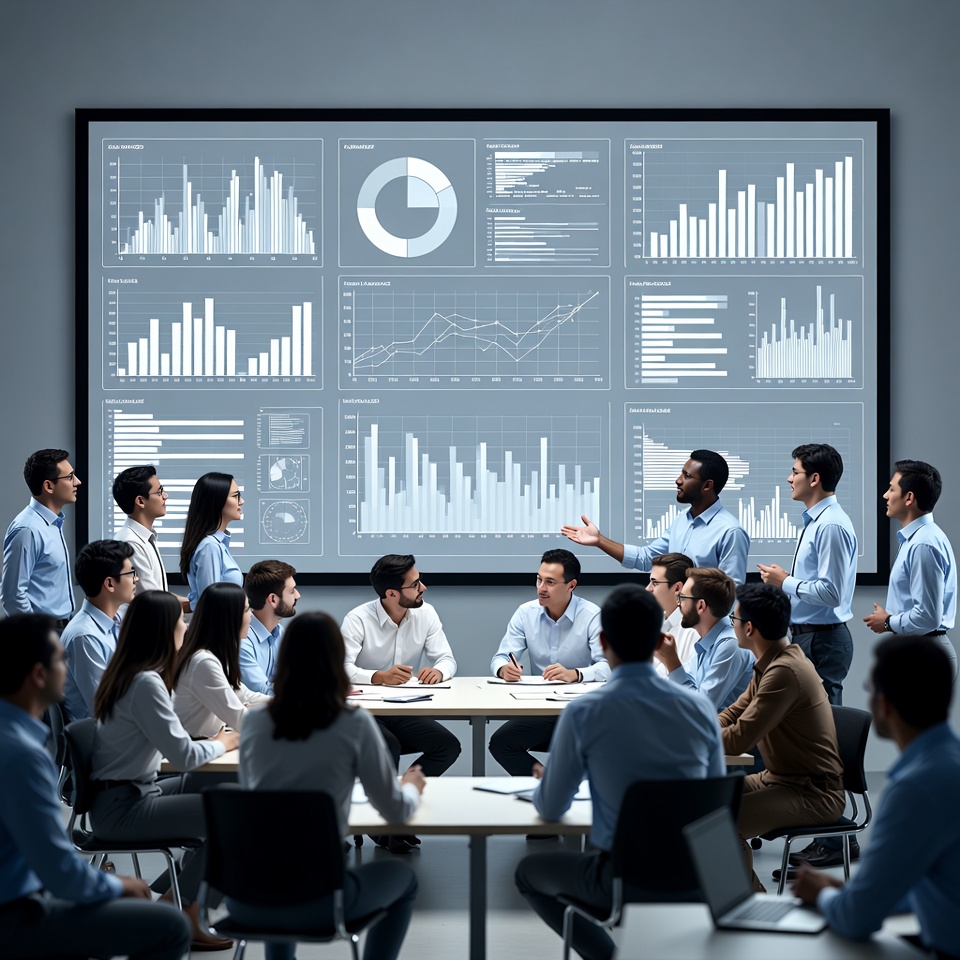 Diverse team meeting analyzing data dashboard