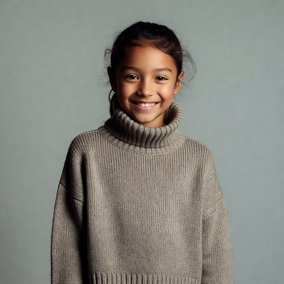 A young mixed-race girl with dark hair tied back smiles warmly at the camera. She wears a cozy beige turtleneck sweater with a relaxed fit. She stands against a plain light gray background.