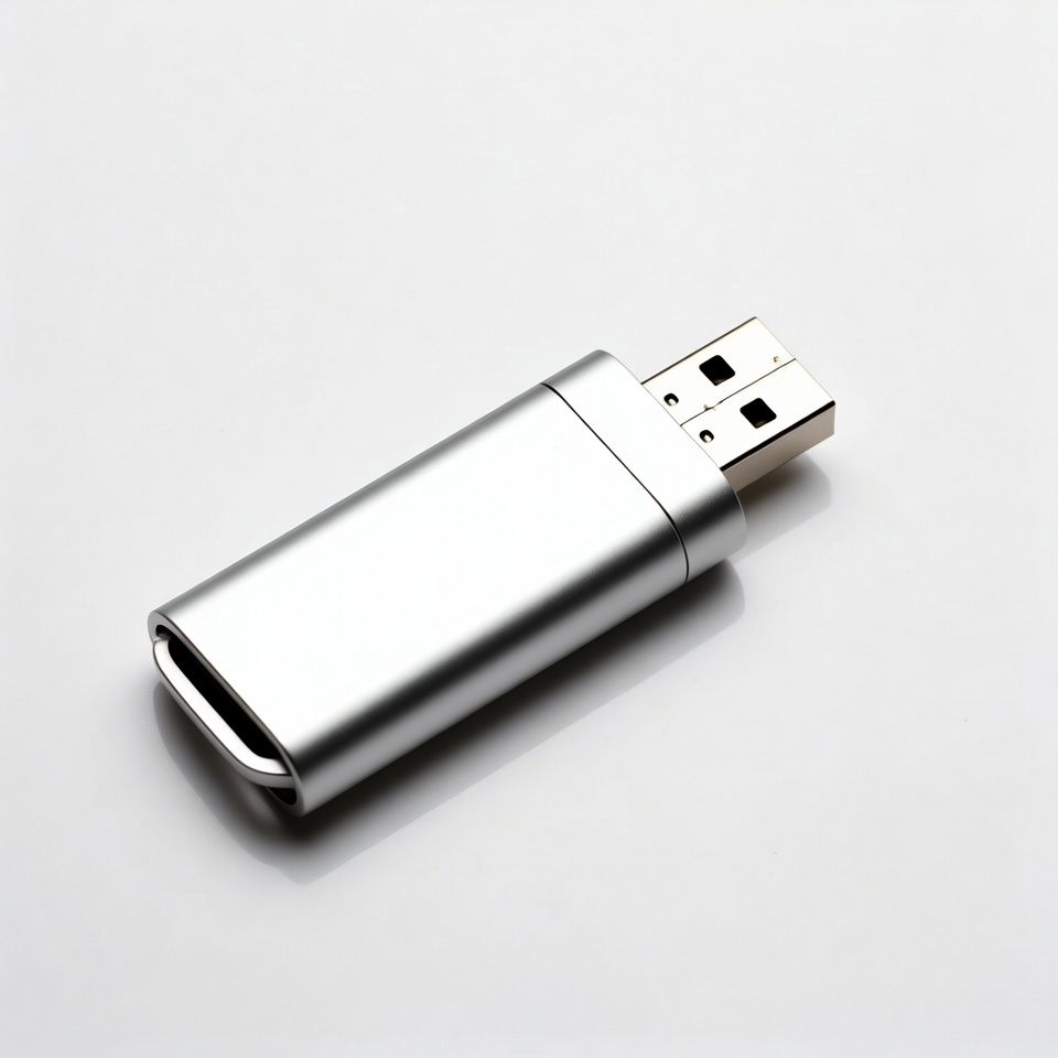 A sleek silver USB flash drive with a metal body is placed on a white background. It features a USB-A connector on one end and a protective cap on the other. The drive has a modern, rectangular design with smooth edges.