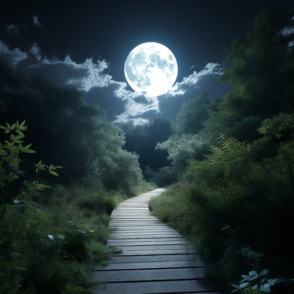 A large full moon shines brightly in the dark night sky above a wooden boardwalk path winding through dense green trees and tall grass. Wispy clouds partially surround the glowing moon, casting a mystical light on the surrounding forest. The path leads into the shadowy depths of the woods.
