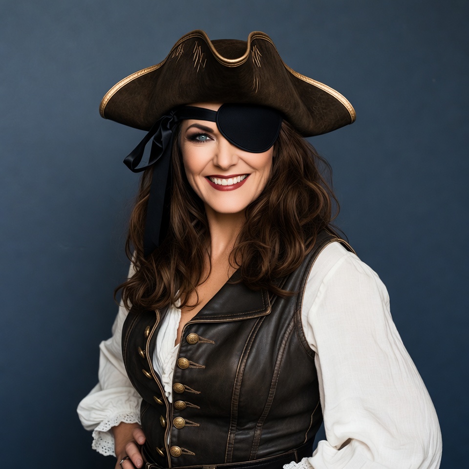 A woman with long brown wavy hair wears a large brown tricorn pirate hat and black eyepatch over one eye. She has a wide smile, dressed in a brown leather vest over a white blouse with lace cuffs, posing confidently against a dark blue background. Her hands are placed on her hips in a playful pirate stance.