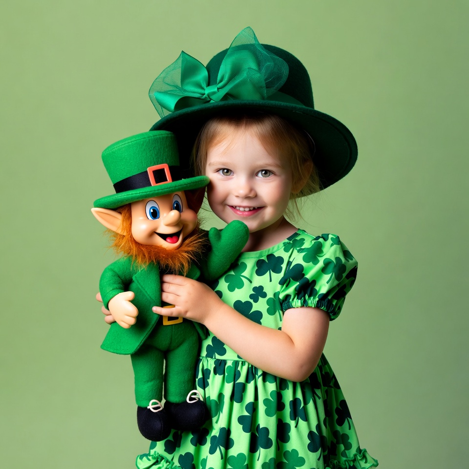 A young girl with red hair smiles while holding a green leprechaun doll on a solid green background. She wears a green shamrock-patterned dress and a large green hat with sheer bow. The plush leprechaun doll has a green top hat, suit, red beard, and cheerful expression.