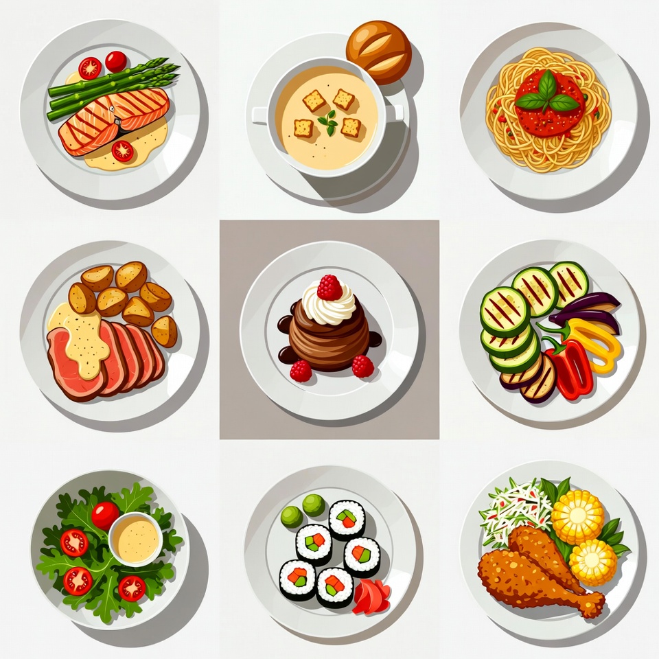 A grid of nine white plates displays various dishes from a top-down view on a white background. The plates feature grilled salmon with asparagus, pasta with tomato sauce, creamy soup with bread, roast beef with potatoes, chocolate cake with whipped cream, grilled vegetables, salad with dressing, sushi rolls, and fried chicken with corn. All illustrations are colorful and detailed.