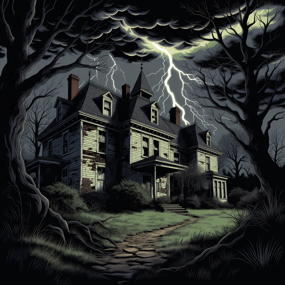 A dilapidated gothic mansion with tall spires and chimneys stands amid dense dark trees during a thunderstorm. Bright lightning bolts illuminate the peeling gray exterior, overgrown bushes, and a stone path leading to the front porch. The scene is framed by twisted branches on a black background.