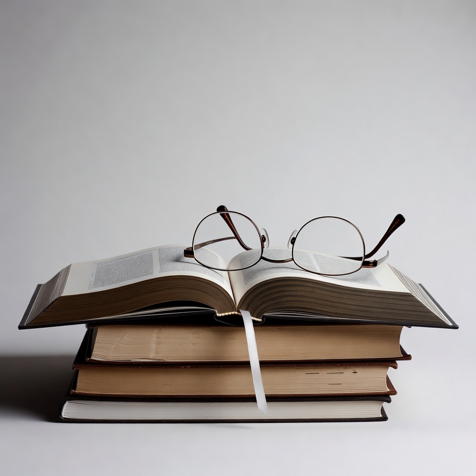 A stack of several hardcover books sits on a plain white background. The top book is open with pages spread wide, and a pair of round tortoiseshell eyeglasses rests across the center. A thin bookmark dangles from the open book.
