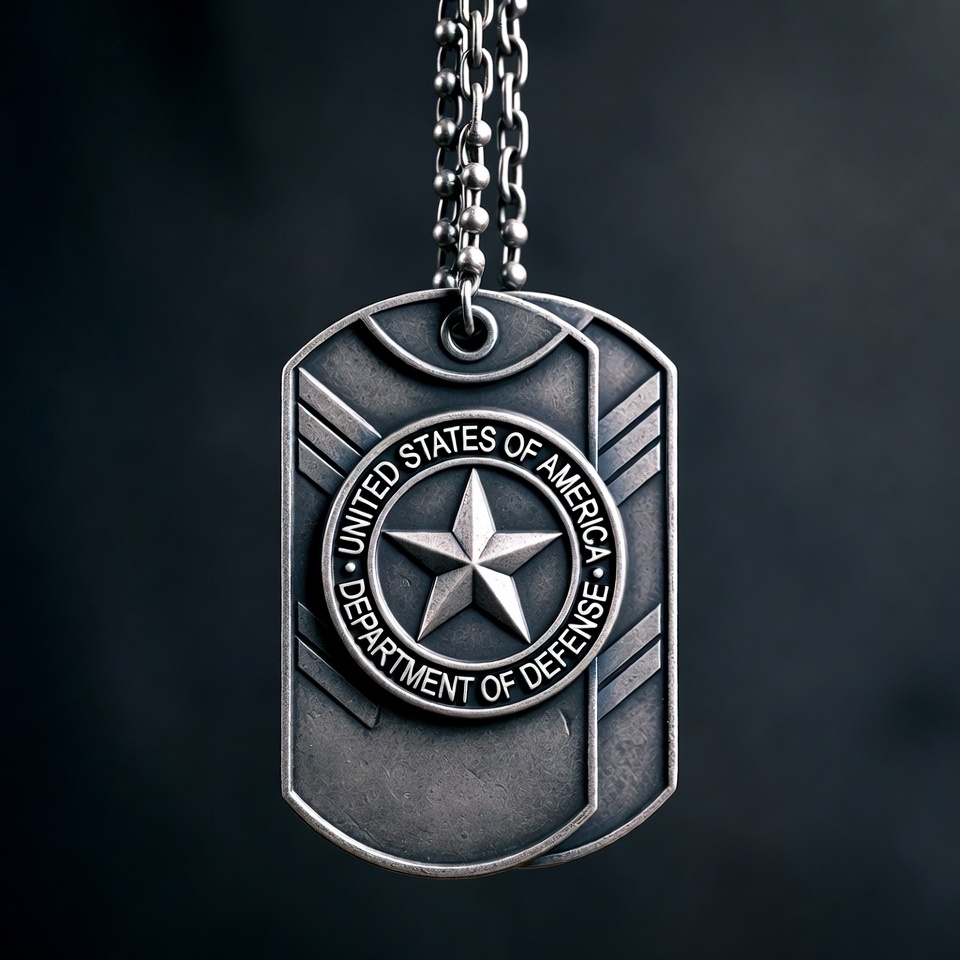 Two silver military dog tags hang from chains against a dark background. The tags feature the United States Department of Defense seal with a central star and diagonal stripes. The text 'United States of America Department of Defense' is engraved on the front.