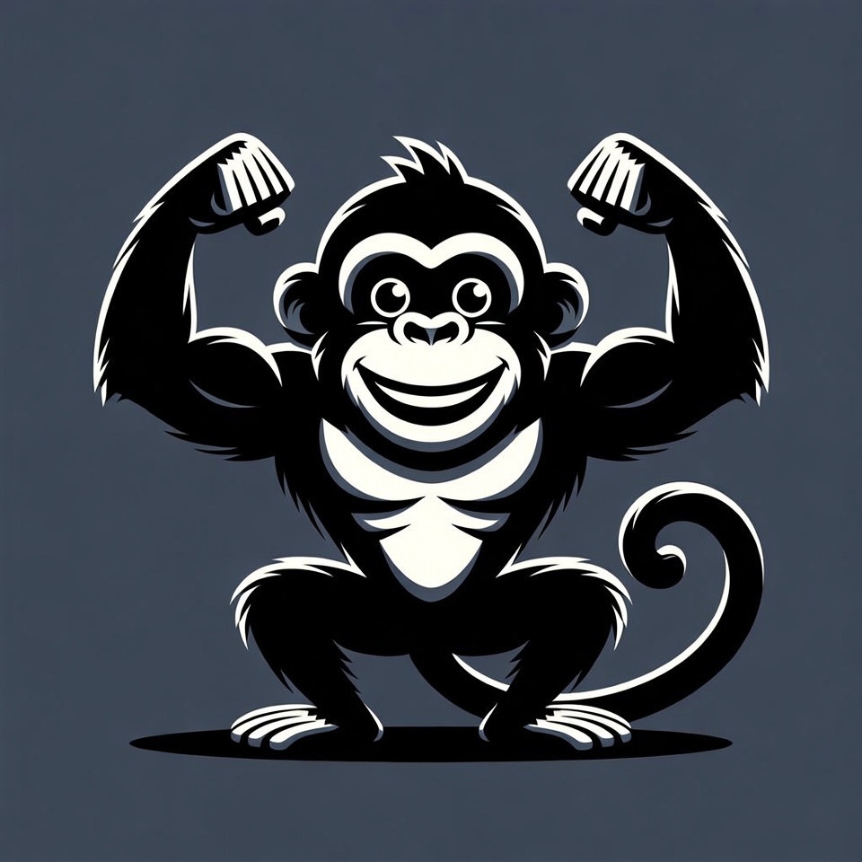 animal, ape, biceps, big eyes, black and white, bodybuilder monkey, cartoon monkey, clipart, cute monkey, dynamic pose, energetic, flexing muscles, funny animal, illustration, isolated background, monkey illustration, muscular monkey, powerful pose, primate, shadow effect, smiling monkey, strong monkey, vector art, monkey