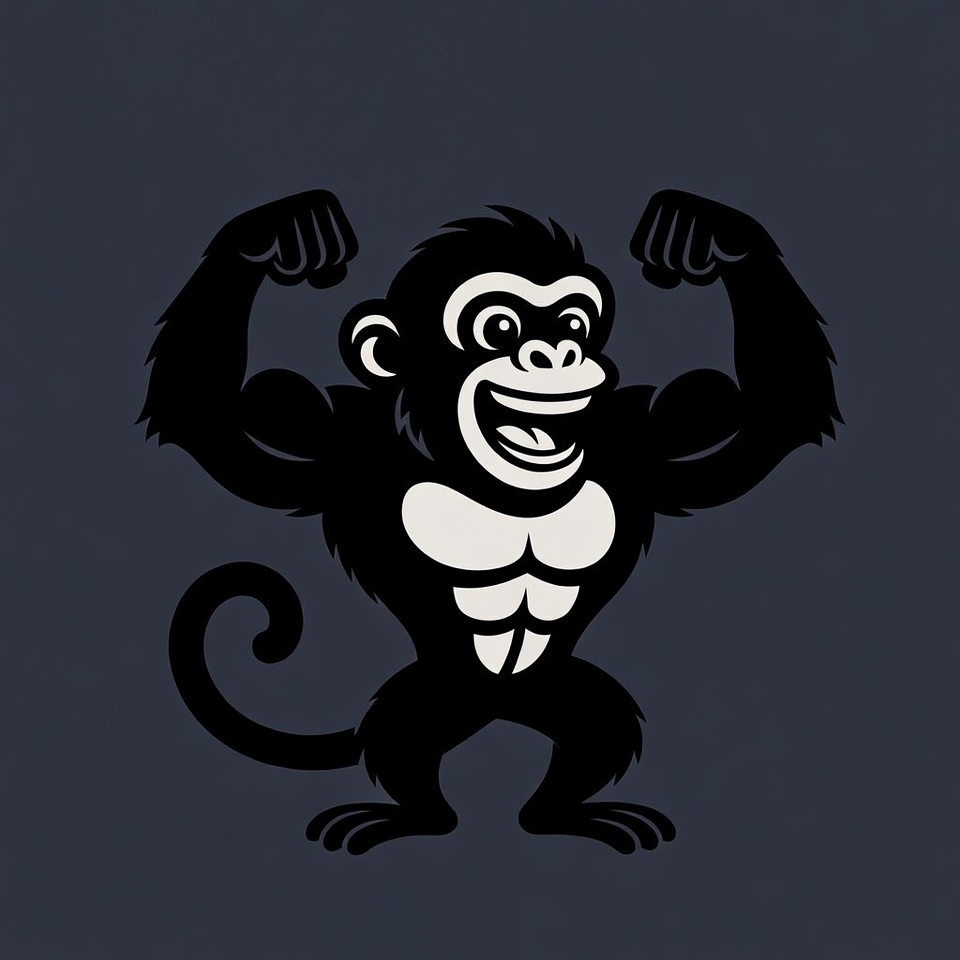 A black silhouette illustration of a muscular monkey flexing its biceps with a big smile. The cartoon ape stands on two legs with defined abs, furry arms, and a curly tail. It features a white chest and face against a dark blue background.