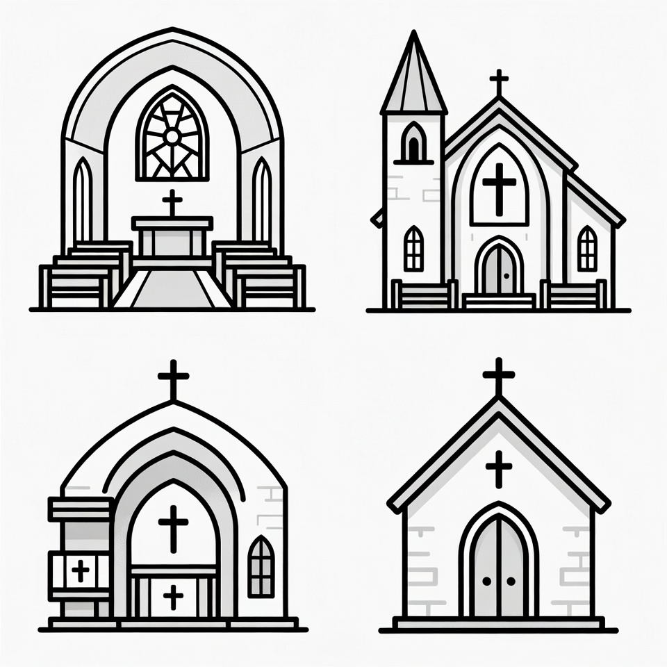 Four black line drawing illustrations of churches on a white background. They feature gothic arches, stained glass windows, crosses, steeples, altars, and stone facades. The designs are simple vector clipart style with clean outlines.