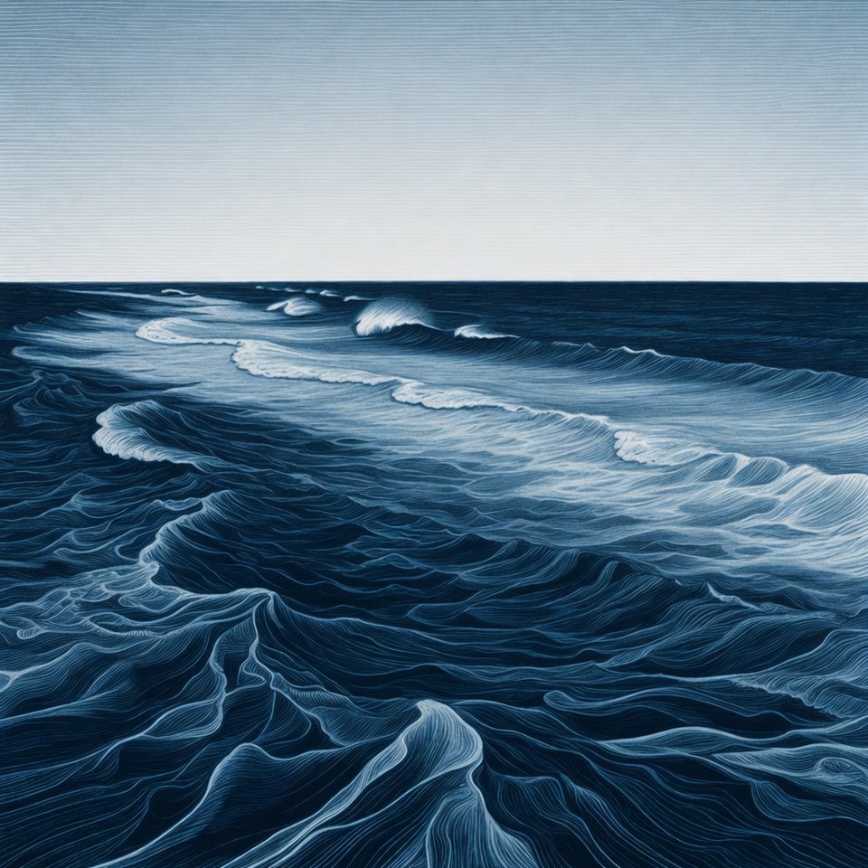 A digital illustration depicts turbulent ocean waves in deep blues and grays rolling towards the horizon. White foam crests the waves under a pale sky. The artwork features intricate line details emphasizing the water's movement.