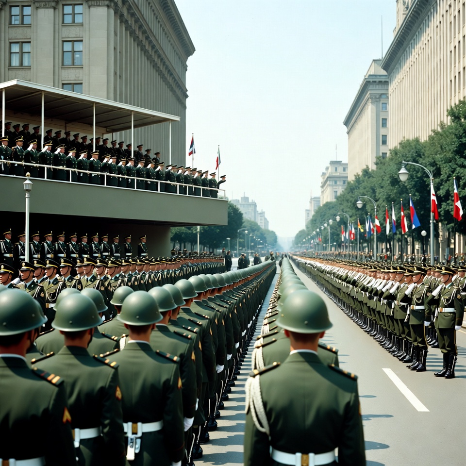 Rows of soldiers in green uniforms and helmets stand in formation on a wide city boulevard flanked by tall beige buildings. A balcony with officers in uniforms overlooks the parade, with numerous international flags lining the street. The scene features a grand avenue with trees and street lamps in the background.