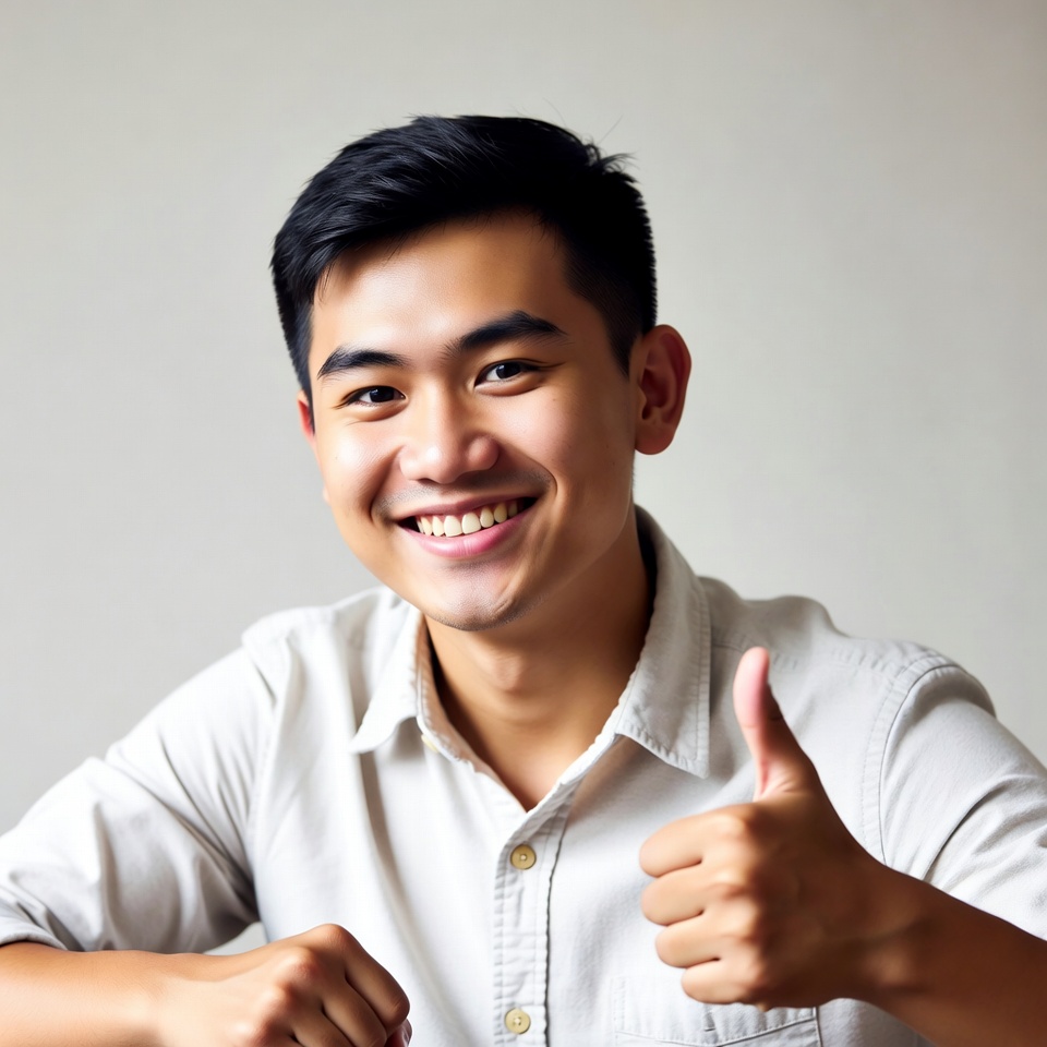 A young Asian man with short black hair smiles broadly while giving a thumbs up gesture. He wears a light-colored button-up shirt and stands against a plain white background. His expression is cheerful and confident.