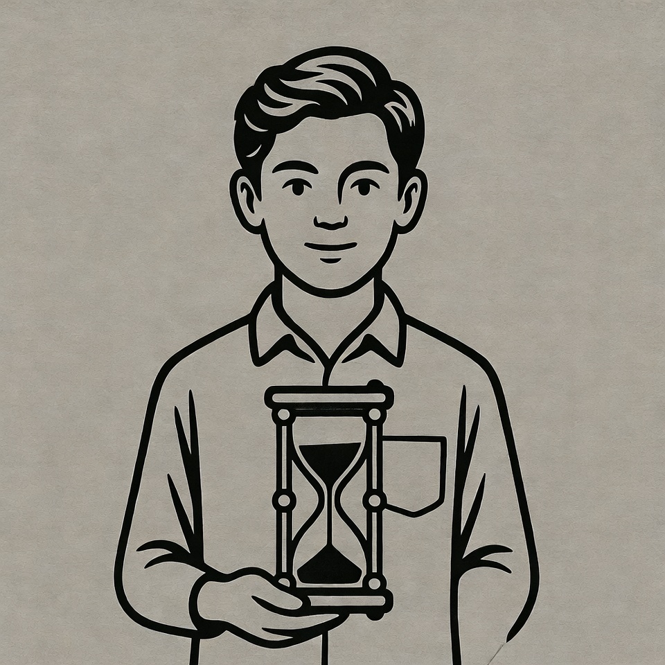 A line art illustration features a young boy with short hair standing and holding an hourglass with both hands. He wears a collared shirt with a pocket and smiles at the viewer. The design is on a solid beige background.