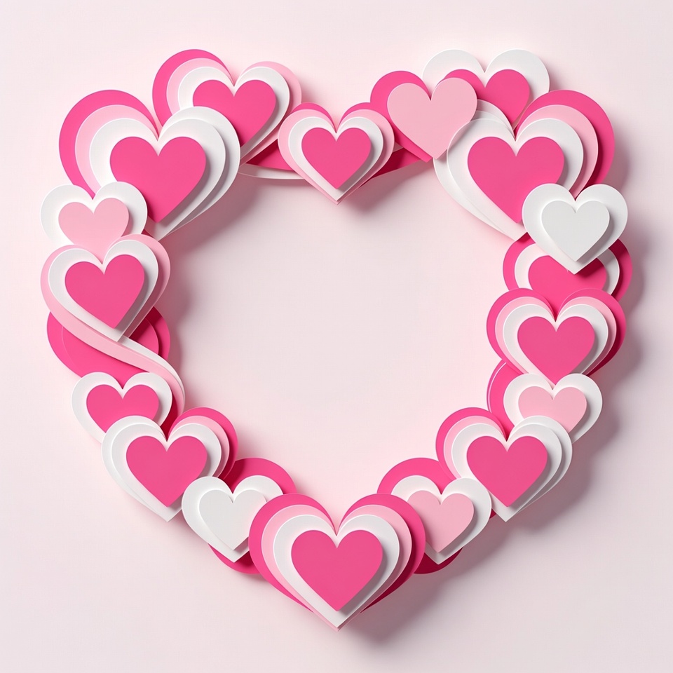 A 3D illustration features overlapping pink and white hearts arranged in a heart-shaped frame on a light pink background. The layered hearts create depth with varying shades of pink and pure white. The center forms an empty space ideal for text or graphics.