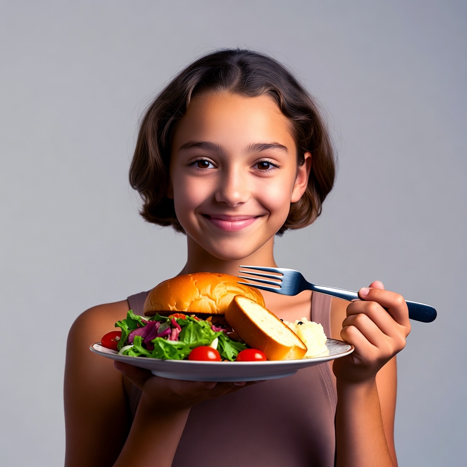 Multiracial, brown hair, burger, female, food, fork, fresh vegetables, gray background, hamburger, healthy eating, holding plate, lettuce, plate, salad, short hair, smiling, tank top, tomatoes, young girl, girl