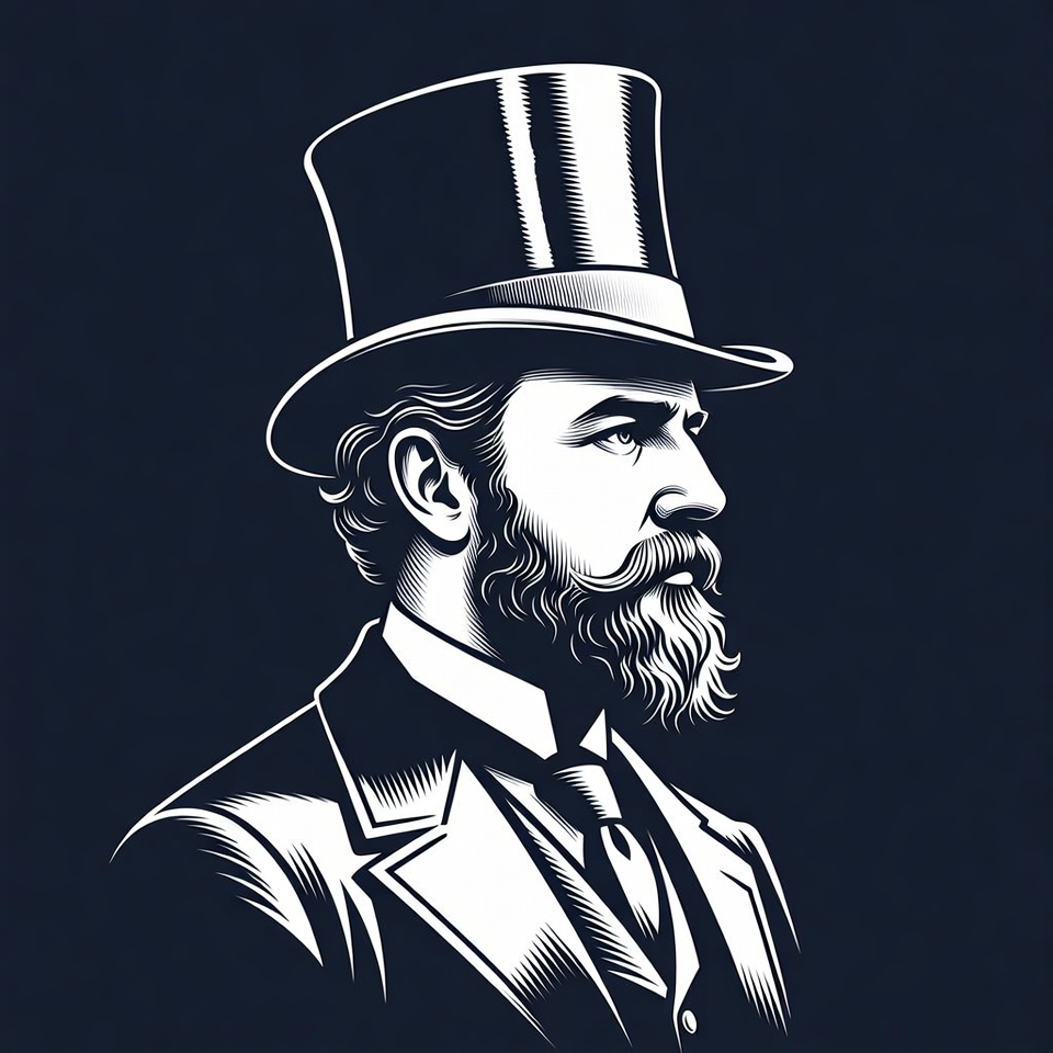 19th century, White, beard, curly hair, dark background, formal suit, gentleman, illustration, line art, male, mustache, profile view, tie, top hat, vest, vintage style, Victorian man