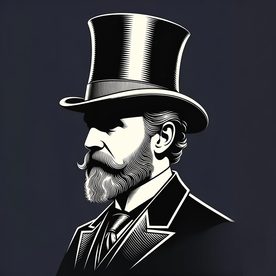 A black and white line art illustration depicts a Victorian-era man in profile view. He wears a tall top hat, a formal suit with vest and tie, and has a curly beard and mustache. His face is partially shadowed under the hat brim against a dark background.