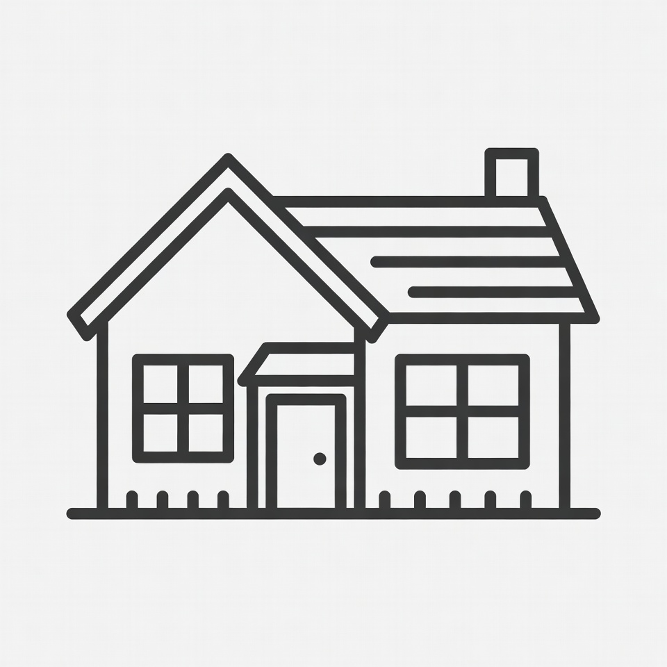 A minimalist line drawing of a house features a gabled roof with chimney, two front windows, a central door with small porch, and a base line. The illustration uses thin black outlines on a white background. No colors or shading are present.