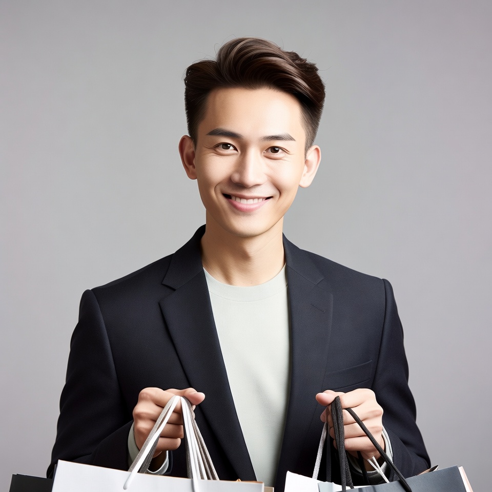 A young Asian man with short dark hair smiles at the camera while holding multiple black and white shopping bags. He wears a black suit jacket over a light gray shirt and stands against a plain gray background. His expression is friendly and confident.
