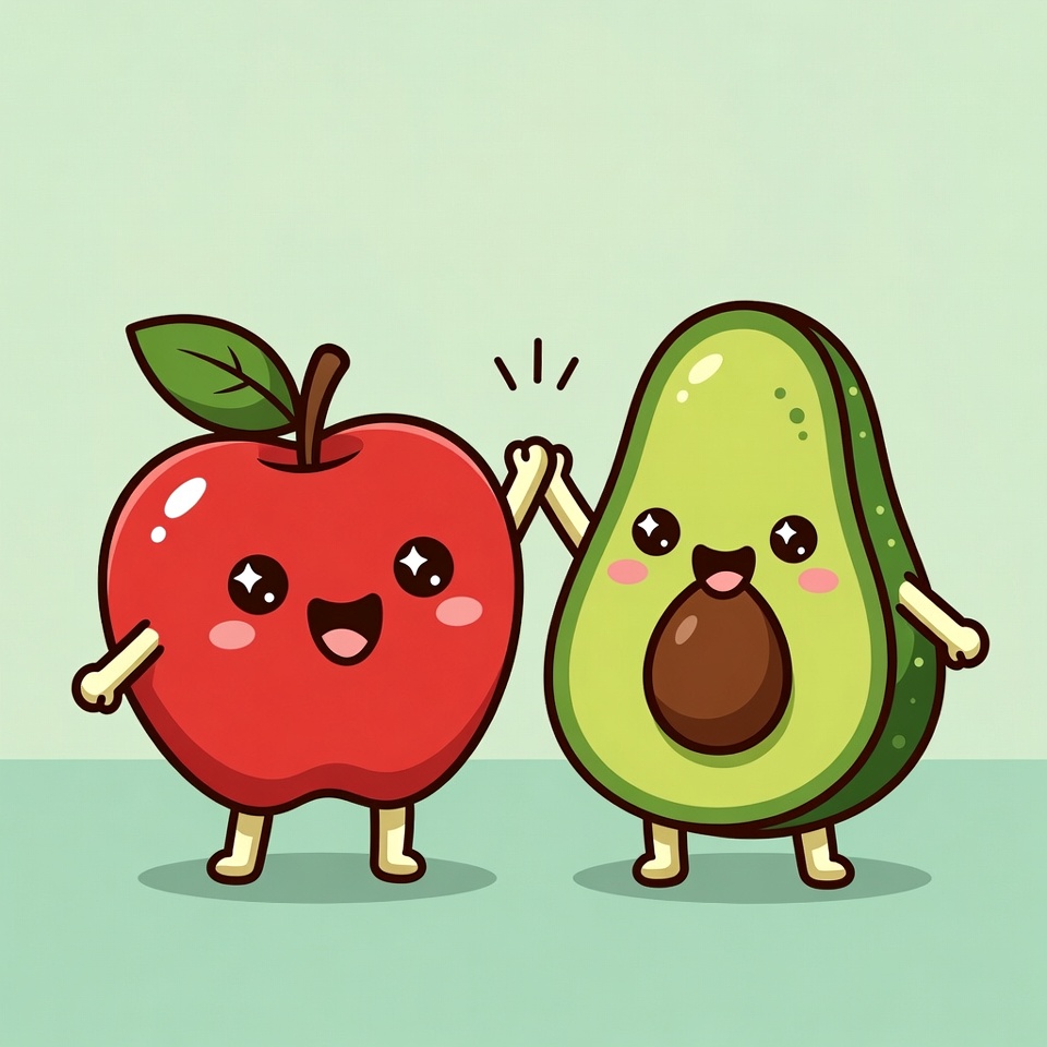 A kawaii red apple with big sparkling eyes and a wide smile high-fives a cheerful green avocado on a light green background. Both fruits have arms and legs, with the apple featuring a green leaf and the avocado showing its pit. The illustration uses vibrant colors and cute cartoon style.