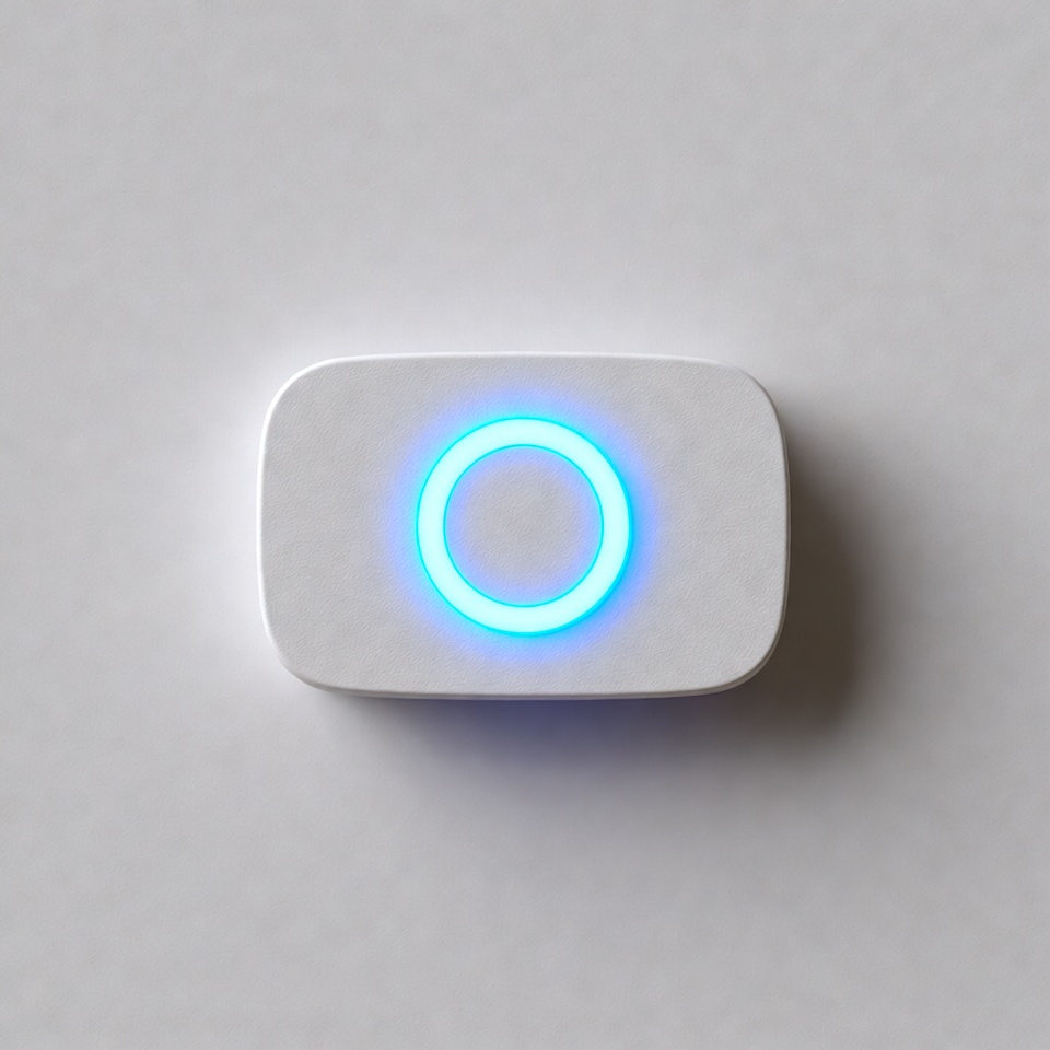3D render, LED ring, blue glow, button light, circular light, cyan light, gadget, glowing ring, home automation, isolated background, modern device, product render, rectangular device, smart button, tech gadget, technology, white background, white device, wireless device, smart device