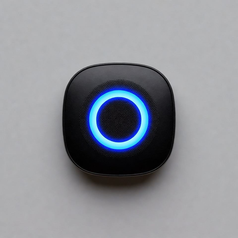 audio device, black speaker, blue light, device, electronics, glowing ring, isolated background, modern speaker, ring light, smart home, speaker grille, square speaker, tech gadget, technology, voice assistant, wireless speaker, smart speaker