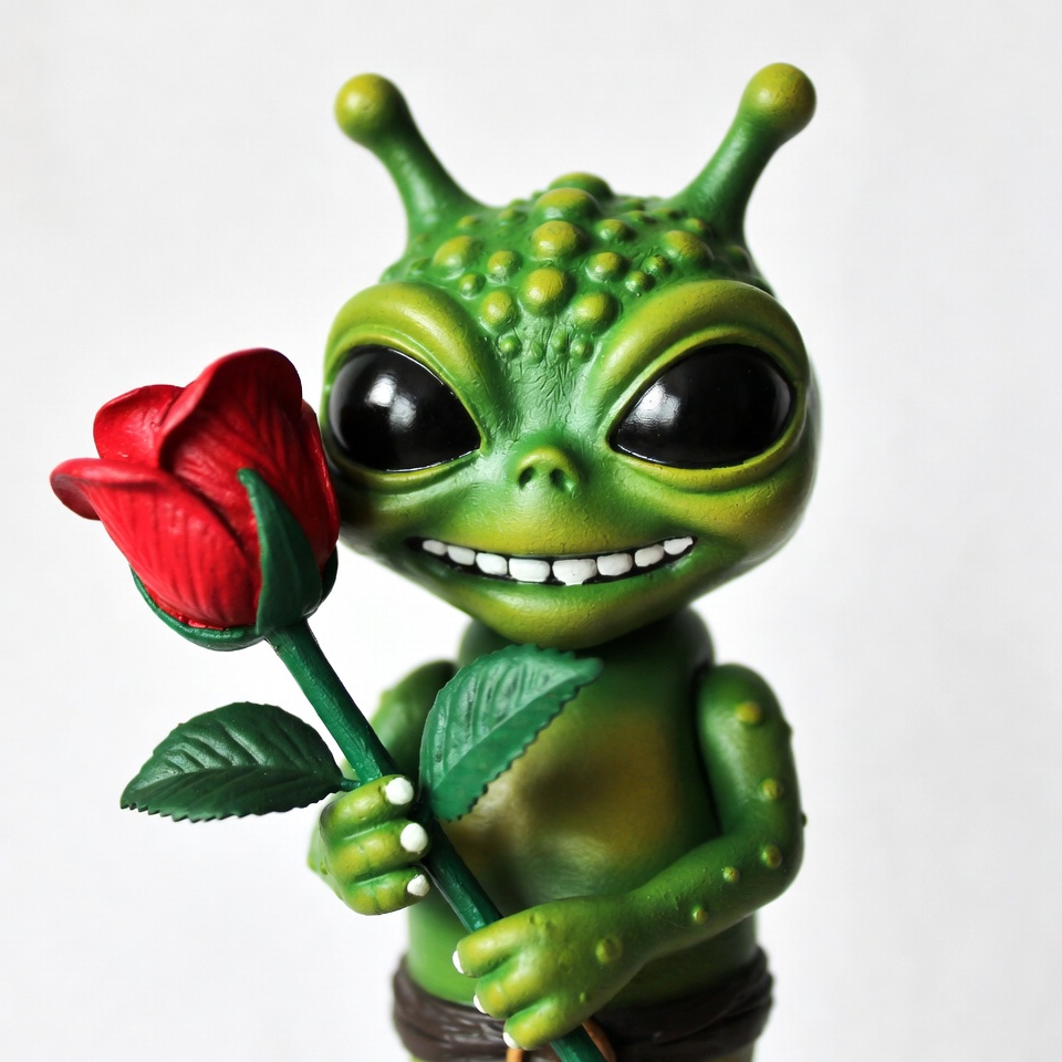 UFO creature, antennae, big eyes, bumpy skin, cartoon alien, cute alien, extraterrestrial, figurine, flower, green alien, holding flower, illustration, monster toy, red rose, sci-fi, sculpture, smiling alien, toy, white background, alien