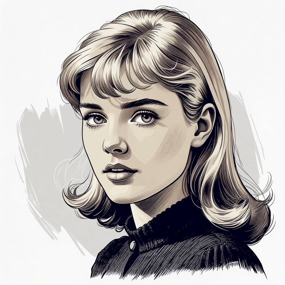 A detailed line art illustration depicts a young woman with shoulder-length blonde hair and bangs, gazing forward with light eyes. She wears a black turtleneck sweater with a subtle collar detail. The portrait is rendered in pencil sketch style on a light gray background.