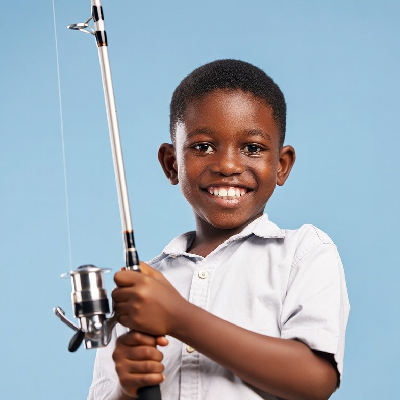 A young African boy with short curly black hair smiles happily while holding a fishing rod with both hands. He wears a light-colored short-sleeve button-up shirt and stands against a solid blue background. The fishing rod features a spinning reel and is positioned vertically across his body.