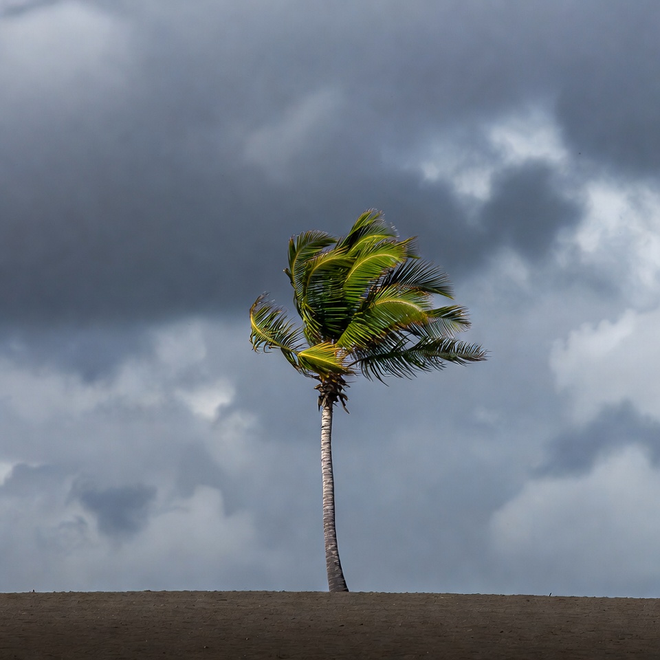 beach, bending tree, clouds, coconut palm, dark clouds, dramatic sky, fronds blowing, gale, gray clouds, green fronds, hurricane, isolated, landscape, nature, outdoor, sand dune, seaside, single tree, stormy sky, tall palm, tempest, tropical, trunk, wind, windy weather, palm tree
