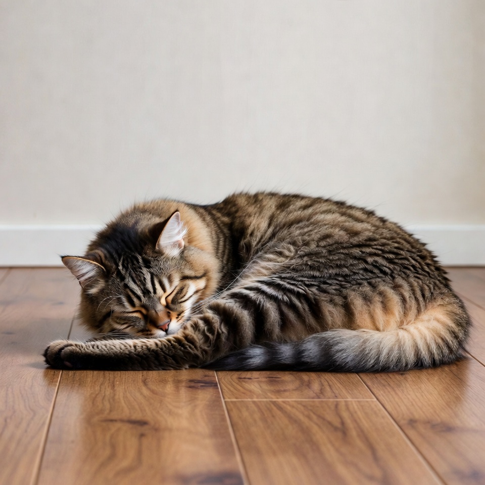 adorable cat, animal, brown cat, cat paw, curled up, domestic cat, fluffy cat, grooming cat, pet cat, resting cat, sleeping cat, striped cat, tabby cat, white wall, wooden floor, cat