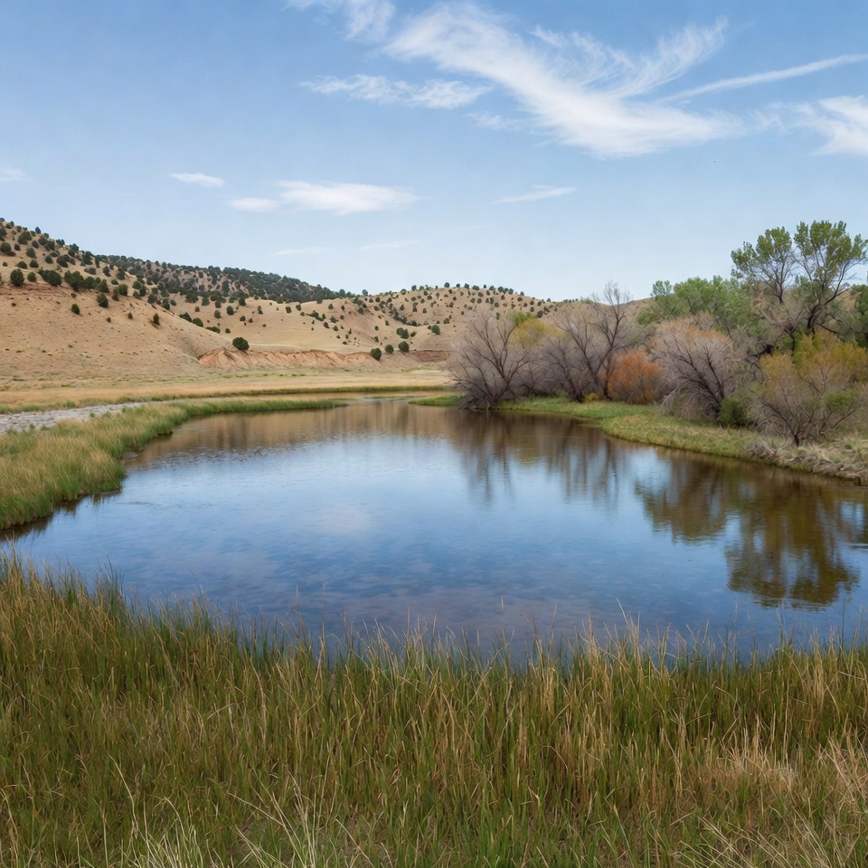 autumn leaves, blue sky, bushes, clouds, cottonwood trees, desert, foliage, golden grass, hills, lake, landscape, nature, outdoors, path, reflection, riparian, riverbank, rocks, scenery, shore, terrain, water, wilderness, pond