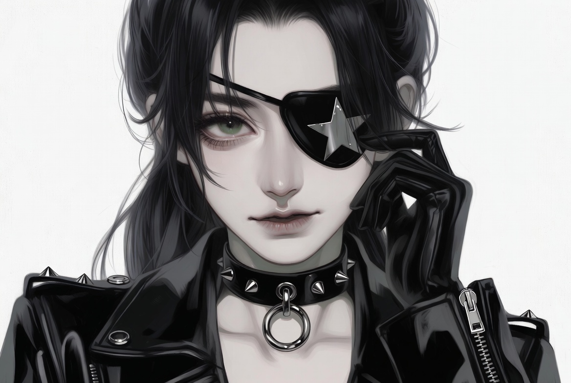 A detailed digital illustration of a young Asian woman with long black hair and a black star eyepatch over one eye. She wears a black leather jacket with studs, a spiked choker with a ring, and black gloves, posing with her hand lifting the eyepatch. Her expression is intense with green visible eye and pale skin on an isolated background.