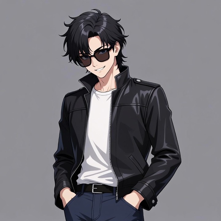 An anime-style young man with black spiky hair wears dark sunglasses and smiles confidently. He has on a black leather jacket over a white t-shirt and blue jeans, with hands in his pockets. The character stands against a plain gray background.