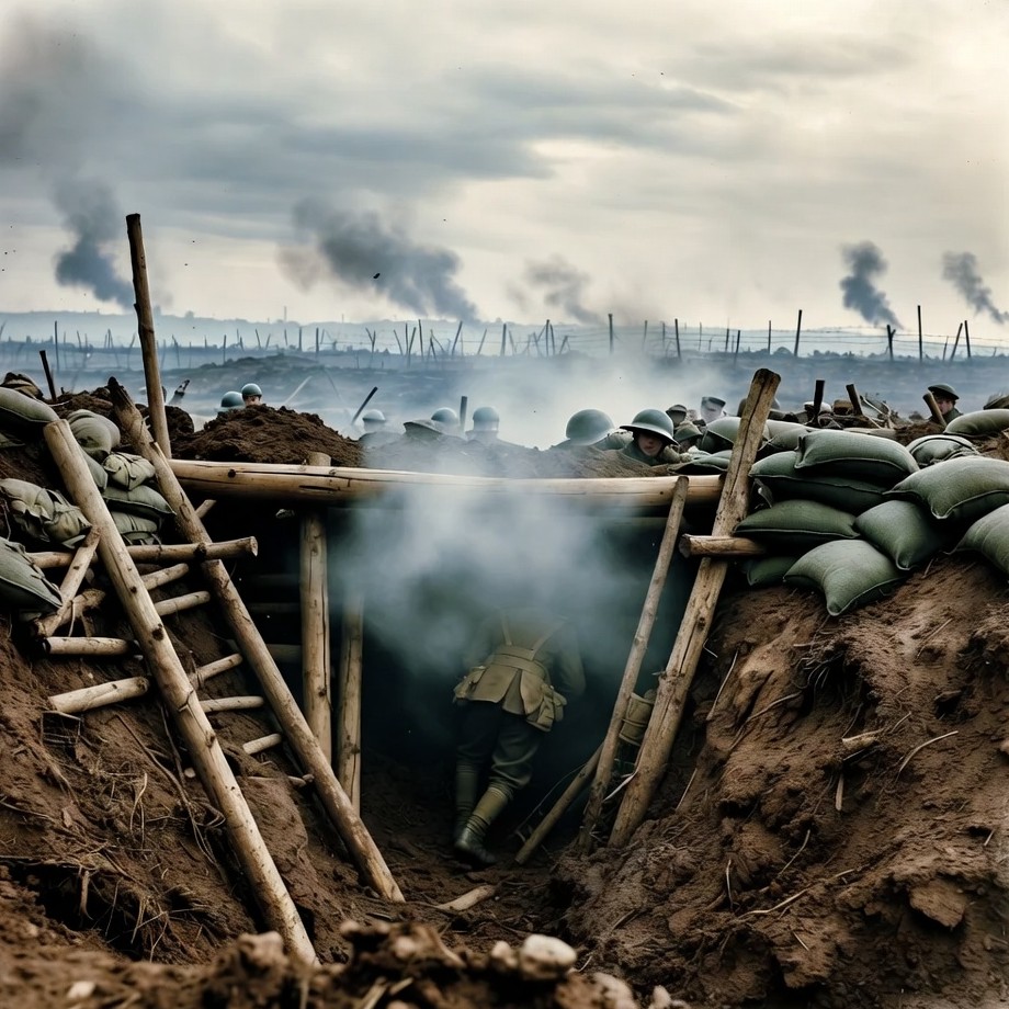 A soldier in a khaki uniform and helmet walks down wooden steps into a muddy World War I trench. Sandbags line the trench walls amid barbed wire and smoke from distant explosions. Several other soldiers in helmets are visible along the trench and in the background under a cloudy sky.