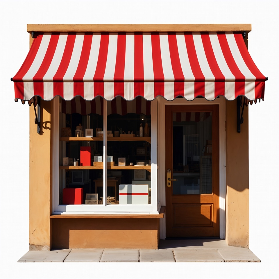 beige building, boxes, clipart, commercial building, display windows, glass windows, illustration, isolated background, market stall, products, red awning, retail shop, shelves, shopfront, store, storefront, striped awning, white stripes, wooden door, shop