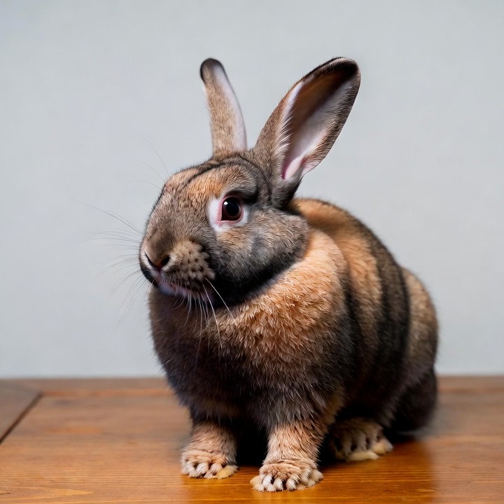 A fluffy Dutch rabbit with brown, white, and orange fur sits on a wooden table. It has long ears, pink nose, and whiskers, looking slightly to the side with alert red eyes. The rabbit is positioned against a plain white background.