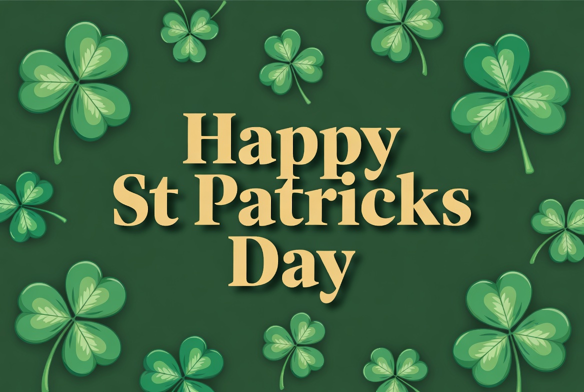 Happy St Patricks, Irish holiday, Patricks Day, St Patrick, clipart, clovers, festive design, four leaf clover, gold text, green background, green clovers, holiday greeting, illustration, shamrocks, vector art, St. Patricks Day