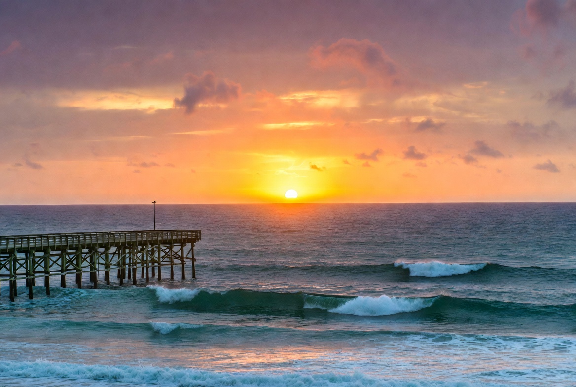 beach, clouds, coastline, crashing waves, evening, golden hour, horizon, isolated background, nature, ocean, orange sky, purple clouds, sea, seascape, sky, sun, sunset, surf, water, waves, wooden pier, pier