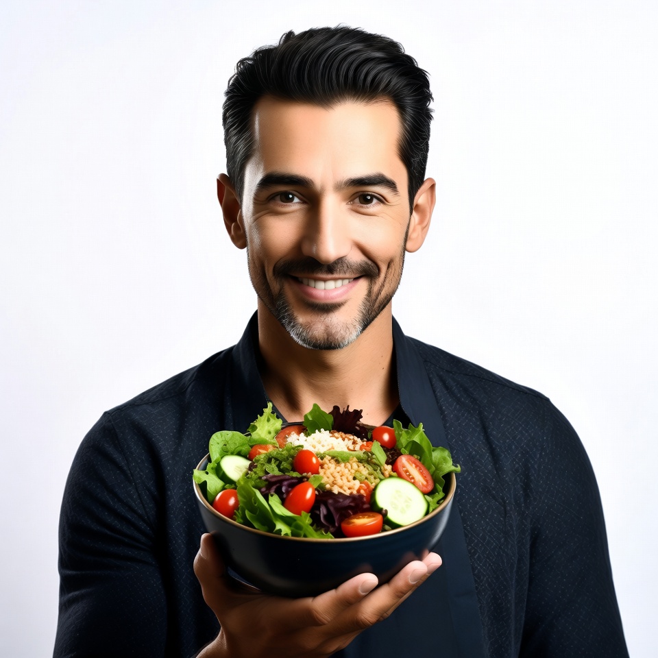 A smiling man with dark hair and a beard holds a large bowl of fresh salad in front of a white background. The salad features mixed greens, cherry tomatoes, cucumbers, and grains. He wears a dark shirt and looks directly at the camera.