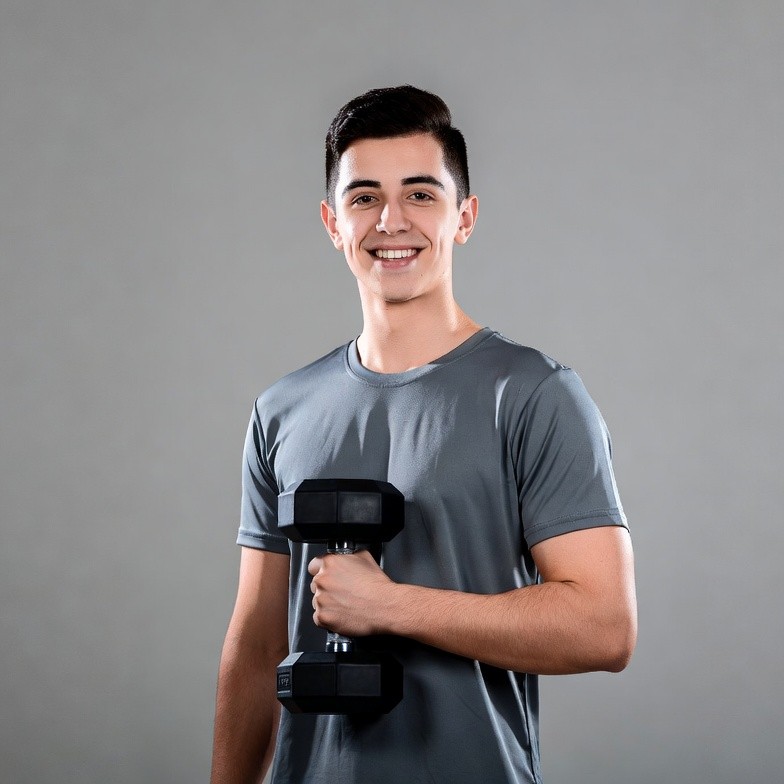 A young man with short dark hair smiles while holding a black dumbbell in his right hand. He wears a gray short-sleeved t-shirt and stands against a plain gray background. His posture is relaxed and athletic.