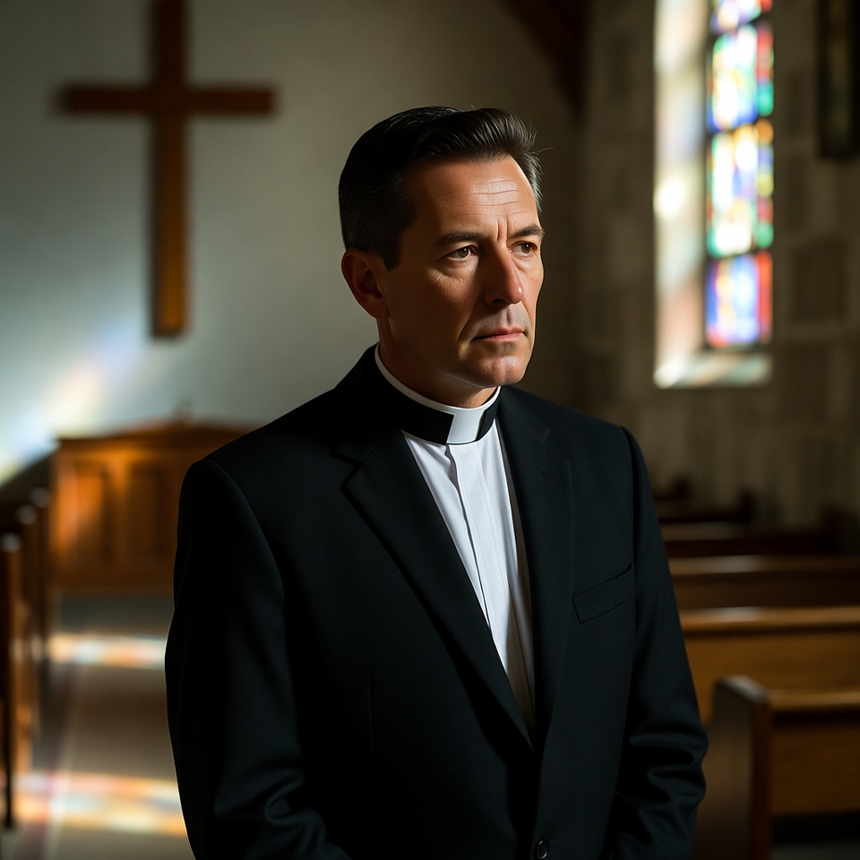 A middle-aged White man dressed as a priest in a black suit and white clerical collar stands in a stone church interior. Large wooden crosses hang on the walls behind him, and stained glass windows cast colorful light. Wooden pews line the background of the dimly lit sanctuary.