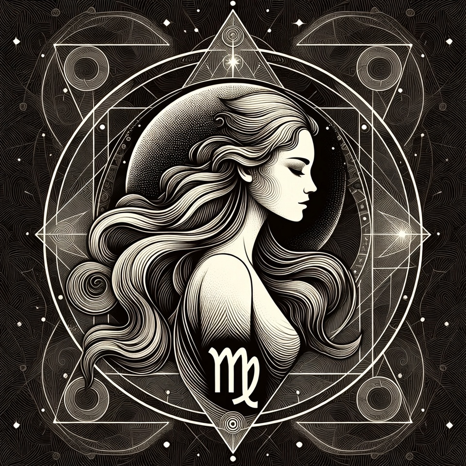 A detailed black and white illustration features a serene woman with long flowing hair in profile view, set within a circular frame. Geometric shapes, stars, and occult symbols surround her against a dark starry background. The Virgo zodiac symbol 'â™' is prominently displayed at the bottom.