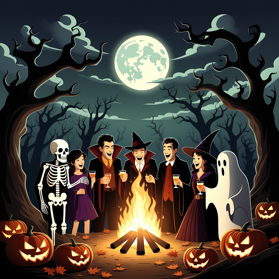 A group of cartoon Halloween characters including a skeleton, ghost, witches, and vampires gathers around a campfire in a dark forest. They hold wine glasses and toast under a full moon surrounded by twisted trees and jack-o'-lanterns. Pumpkins and fallen leaves scatter the ground near the bright flames.