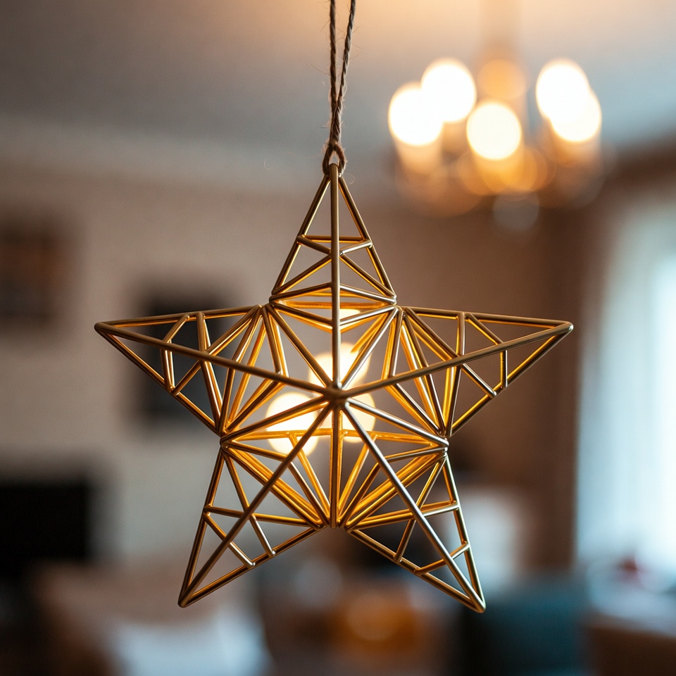 A geometric golden wire star ornament with internal light hangs from a string in a warmly lit room. The star features an intricate lattice design and glows softly against a blurred background of bokeh chandelier lights and furniture. The cozy indoor setting includes a window and sofa in the distance.