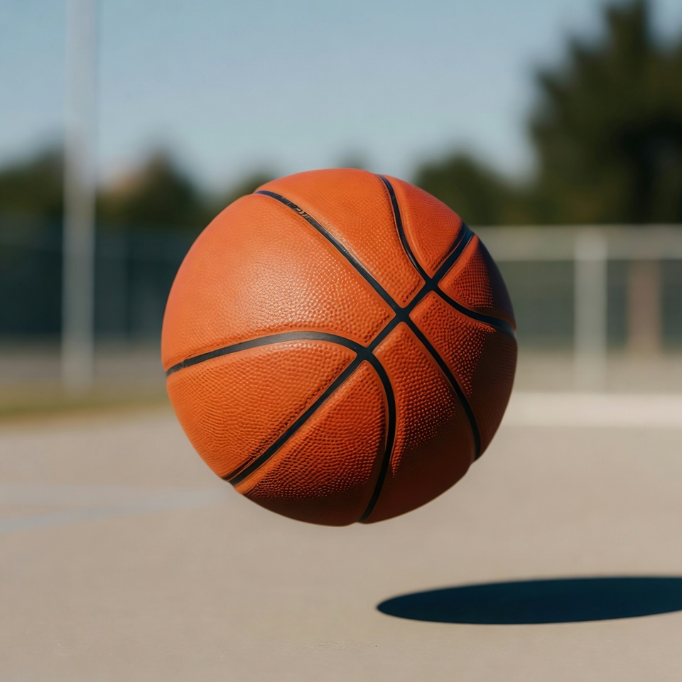 An orange basketball hovers above a concrete basketball court surface. A dark shadow falls beneath it on the ground. In the background, a chain-link fence, basketball pole, and green trees are visible under a clear blue sky.