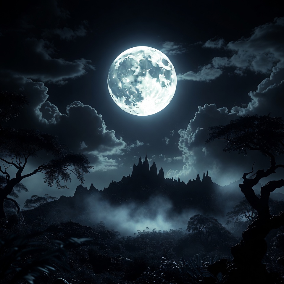 ancient castle, black trees, castle, clouds, dark forest, dark night, dramatic sky, eerie atmosphere, fantasy scene, fog, foggy mountains, full moonlit scene, gothic architecture, gothic castle, jungle trees, lunar glow, mist, misty valley, moon, moonlight, mountains, night landscape, night sky, silhouette, spooky landscape, twisted trees, full moon
