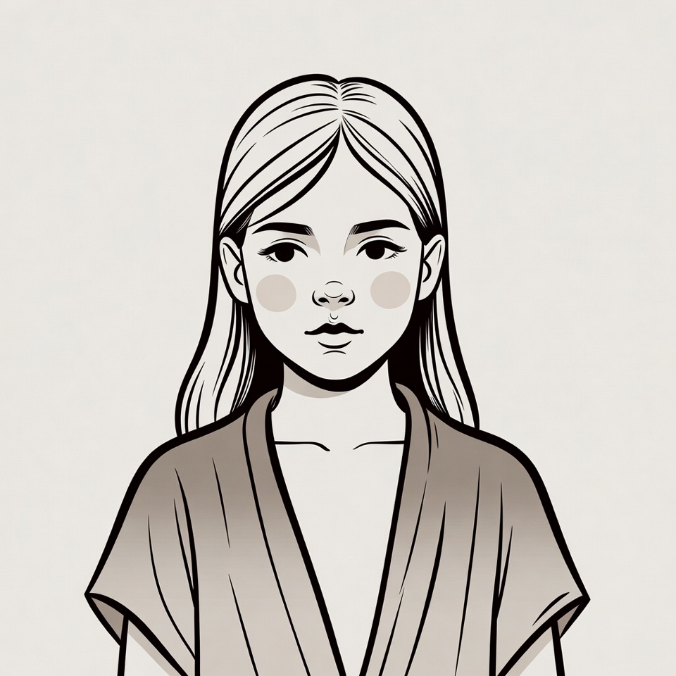 A line art illustration depicts a young girl with long blonde hair and rosy cheeks facing forward. She wears a beige kimono-style robe with a V-neckline. The image features a simple isolated background.